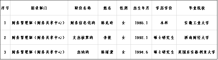 根据《安徽省投资J9九游会AG真人官网控股有限公司党委会议纪要(九)》,应聘安徽省投资J9九游会AG真人官网控股有限公司(下称“省投资J9九游会AG真人官网”)的陈兆玲、李筱、陈雨蒙,经报名、初试、复试、体检、背景调查等程序,符合本次社会招聘的录用条件,拟录用为省投资J9九游会AG真人官网员工。现将拟录用人员名单公示如下: