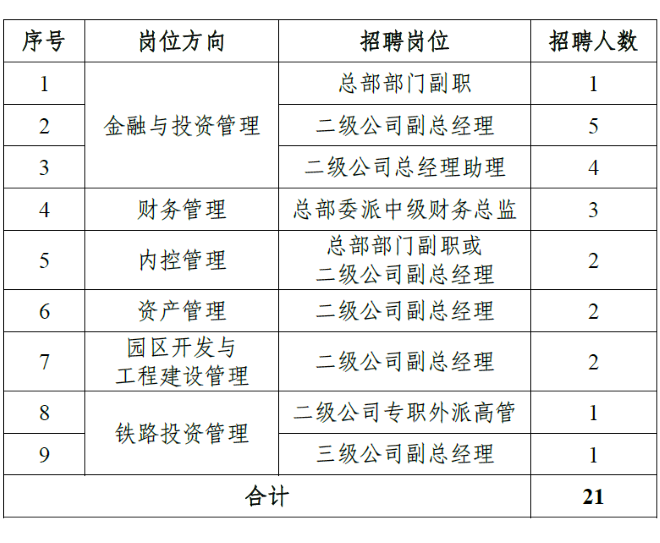 本次面向社会公开招聘高端经营管理人才21名。招聘岗位及人数详见下表: